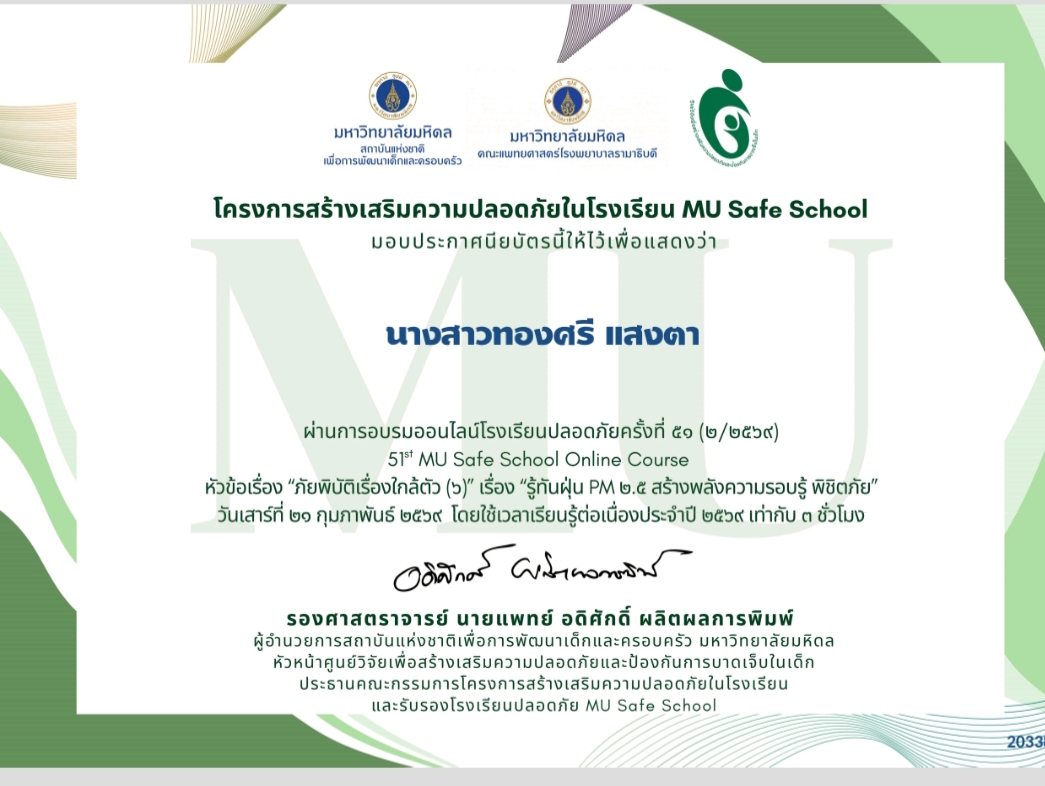 | 2026-02-21 | นางสาวทองศรี แสงตา | ครูชำนาญการ | การอบรมเชิงปฎิบัติการโรงเรียนปลอดภัย ครั้งที่ 51(2/69) หัวข้อเรื่อง “ภัยพิบัติเรื่องใกล้ตัว (๖)” เรื่อง “รู้ทันฝุ่น PM2.5 สร้างพลังความรอบรู้ พิชิตภัย” | ออนไลน์ | 2568 | แก้ไข | |