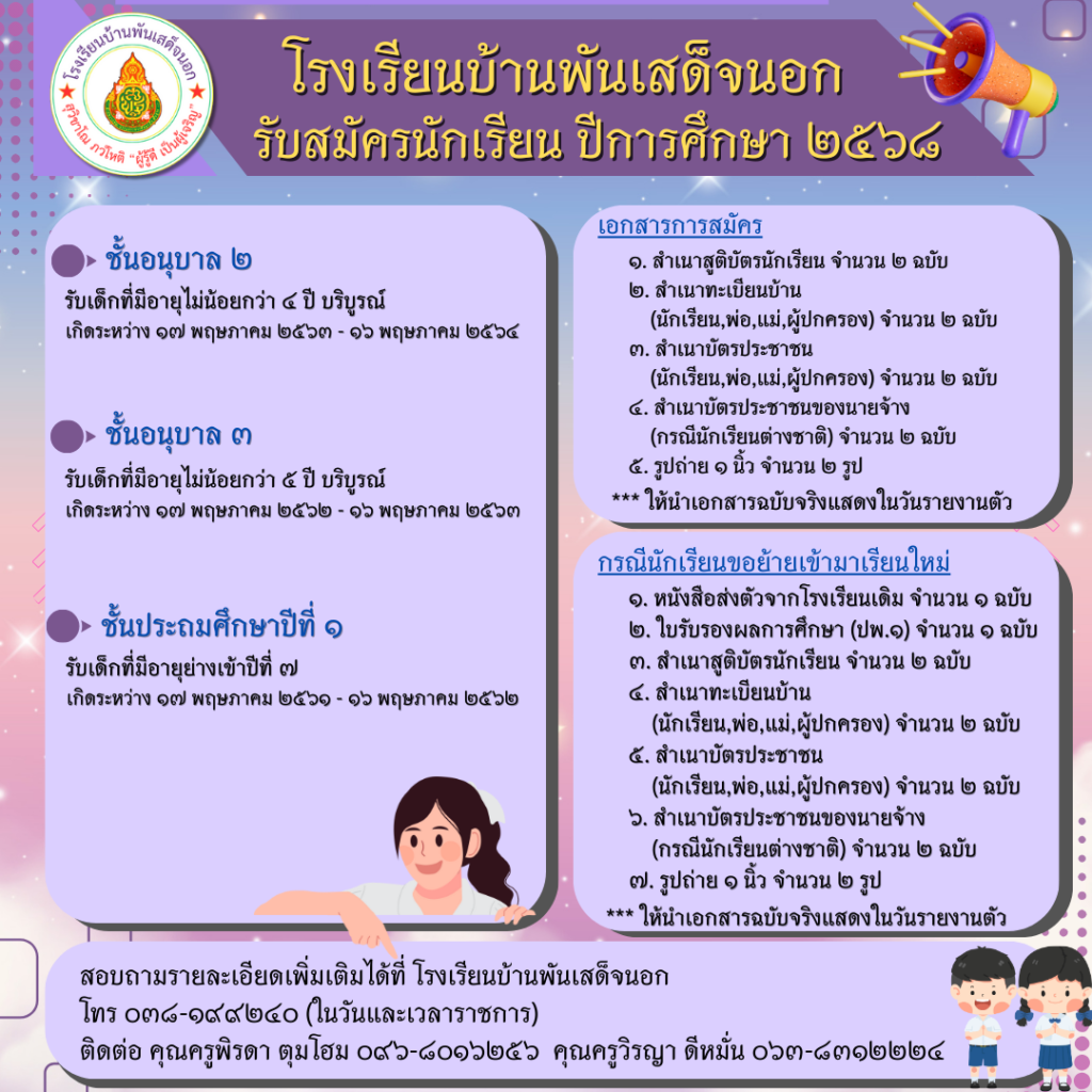 ประกาศรายชื่อผู้มีสิทธิ์สอบคัดเลือกบุคคลเพื่อจ้างเป็นลูกจ้างชั่วคราวตำแแหน่งครูจ้างสอนวิชาเอกภาษาอังกฤษและตำแหน่งพี่เลี้ยงเด็กปฐมวัยโรงเรียนบ้านพันเสด็จนอก ประกาศรับสมัครสอบคัดเลือกบุคคลเพื่อจ้างเป็นลูกจ้างชั่วคราวตำแแหน่งครูจ้างสอนวิชาเอกภาษาอังกฤษและตำแหน่งพี่เลี้ยงเด็กปฐมวัย รับสมัครตั้งแต่วันที่ 28 มีนาคม- 6 เมษายน 2567 ที่โรงเรียนบ้านพันเสด็จนอก