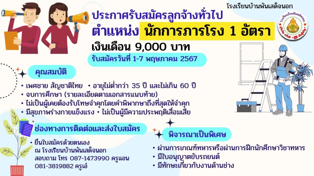 โรงเรียนบ้านพันเสด็จนอก ประกาศรับสมัครลูกจ้างทั่วไป ตำแหน่ง นักการภารโรง จำนวน 1 อัตรา รับสม้ครตั้งแต่วันที่ 1 ถึง 7 พฤษภาคม 2567