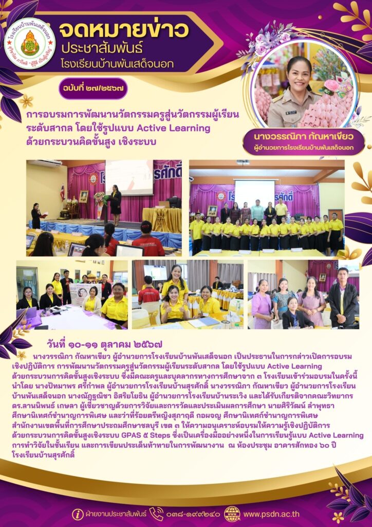 นางวรรณิภา กัณหาเขียว ผู้อำนวยการโรงเรียนบ้านพันเสด็จนอก เป็นประธานในการกล่าวเปิดการอบรมเชิงปฏิบัติการ การพัฒนานวัตกรรมครูสู่นวัตกรรมผู้เรียนระดับสากล โดยใช้รูปแบบ Active Learning ด้วยกระบวนการคิดขั้นสูงเชิงระบบ ซึ่งมีคณะครูและบุคลากรทางการศึกษาจาก ๓ โรงเรียนเข้าร่วมอบรมในครั้งนี้ นำโดย นางปัทมาพร ศรีกำพล ผู้อำนวยการโรงเรียนบ้านสุรศักดิ์ นางวรรณิภา กัณหาเขียว ผู้อำนวยการโรงเรียนบ้านพันเสด็จนอก นางณัฏฐณิชา อิสริยโยธิน ผู้อำนวยการโรงเรียนบ้านระเวิง และได้รับเกียรติจากคณะวิทยากร ดร.ลานนิพนธ์ เกษลา ผู้เชี่ยวชาญด้วยการวิจัยและการวัดและประเมินผลการศึกษา นายศิริวัฒน์ ลำพุทธา ศึกษานิเทศก์ชำนาญการพิเศษ และว่าที่ร้อยตรีหญิงสุภาฤดี กอผจญ ศึกษานิเทศก์ชำนาญการพิเศษ สำนักงานเขตพื้นที่การศึกษาประถมศึกษาชลบุรี เขต ๓ ให้ความอนุเคราะห์อบรมให้ความรู้เชิงปฏิบัติการ ด้วยกระบวนการคิดขั้นสูงเชิงระบบ GPAS ๕ Steps ซึ่งเป็นเครื่องมืออย่างหนึ่งในการเรียนรู้แบบ Active Learning การทำวิจัยในชั้นเรียน และการเขียนประเด็นท้าทายในการพัฒนางาน ณ ห้องประชุม อาคารสักทอง ๖๐ ปี โรงเรียนบ้านสุรศักดิ์