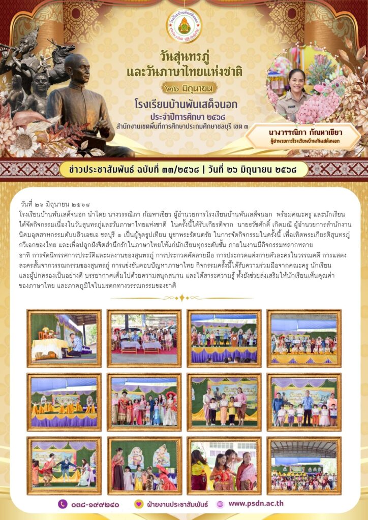 โรงเรียนบ้านพันเสด็จนอก นำโดย นางวรรณิภา กัณหาเขียว ผู้อำนวยการโรงเรียนบ้านพันเสด็จนอก พร้อมคณะครู และนักเรียนได้จัดกิจกรรมเนื่องในวันสุนทรภู่และวันภาษาไทยแห่งชาติ ในครั้งนี้ได้รับเกียรติจาก นายธวัชศักดิ์ เกิดมณี ผู้อำนวยการสำนักงานนิคมอุตสาหกรรมดับบลิวเอชเอ ชลบุรี ๑ เป็นผู้จุดธูปเทียน บูชาพระรัตนตรัย ในการจัดกิจกรรมในครั้งนี้ เพื่อเทิดพระเกียรติสุนทรภู่ กวีเอกของไทย และเพื่อปลูกฝังจิตสำนึกรักในภาษาไทยให้แก่นักเรียนทุกระดับชั้น ภายในงานมีกิจกรรมหลากหลายอาทิ การจัดนิทรรศการประวัติและผลงานของสุนทรภู่ การประกวดคัดลายมือ การประกวดแต่งกายตัวละครในวรรณคดี การแสดงละครสั้นจากวรรณกรรมของสุนทรภู่ การแข่งขันตอบปัญหาภาษาไทย กิจกรรมครั้งนี้ได้รับความร่วมมือจากคณะครู นักเรียนและผู้ปกครองเป็นอย่างดี บรรยากาศเต็มไปด้วยความสนุกสนาน และได้สาระความรู้ ทั้งยังช่วยส่งเสริมให้นักเรียนเห็นคุณค่าของภาษาไทย และภาคภูมิใจในมรดกทางวรรณกรรมของชาติ