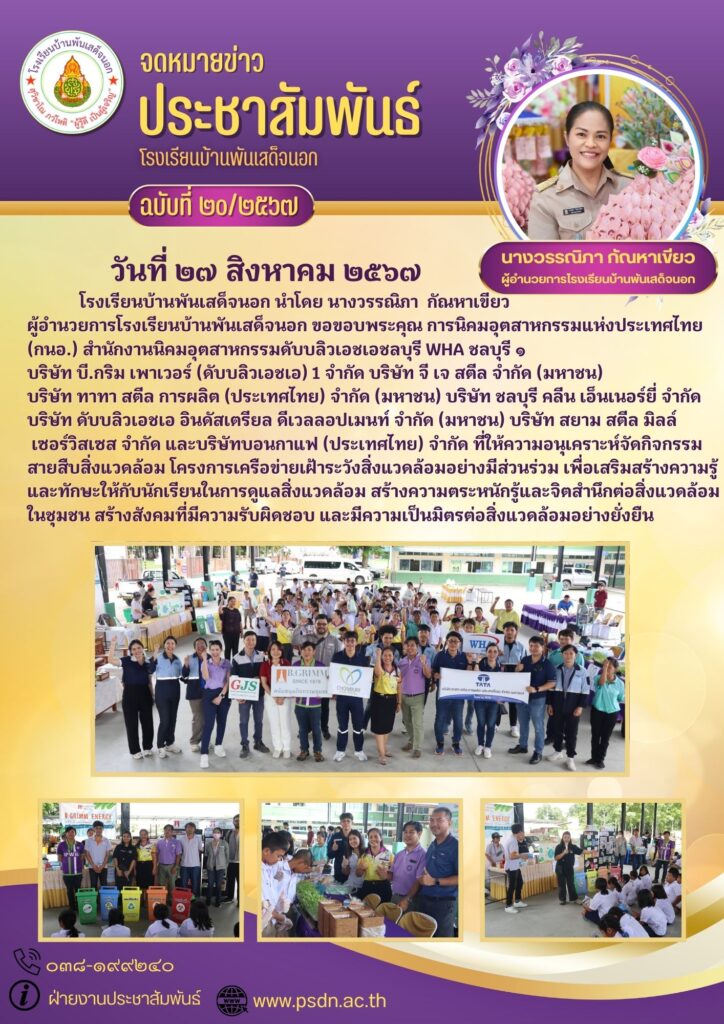 โรงเรียนบ้านพันเสด็จนอก นำโดย นางวรรณิภา กัณหาเขียว ผู้อำนวยการโรงเรียนบ้านพันเสด็จนอก ขอขอบพระคุณ การนิคมอุตสาหกรรมแห่งประเทศไทย (กนอ.) สำนักงานนิคมอุตสาหกรรมดับบลิวเอชเอชลบุรี WHA ชลบุรี ๑ บริษัท บี.กริม เพาเวอร์ (ดับบลิวเอชเอ) 1 จำกัด บริษัท จี เจ สตีล จำกัด (มหาชน) บริษัท ทาทา สตีล การผลิต (ประเทศไทย) จำกัด (มหาชน) บริษัท ชลบุรี คลีน เอ็นเนอร์ยี่ จำกัด บริษัท ดับบลิวเอชเอ อินดัสเตรียล ดีเวลลอปเมนท์ จำกัด (มหาชน) บริษัท สยาม สตีล มิลล์ เซอร์วิสเซส จำกัด และบริษัทบอนกาแฟ (ประเทศไทย) จำกัด ที่ให้ความอนุเคราะห์จัดกิจกรรม สายสืบสิ่งแวดล้อม โครงการเครือข่ายเฝ้าระวังสิ่งแวดล้อมอย่างมีส่วนร่วม เพื่อเสริมสร้างความรู้และทักษะให้กับนักเรียนในการดูแลสิ่งแวดล้อม สร้างความตระหนักรู้และจิตสำนึกต่อสิ่งแวดล้อมในชุมชน สร้างสังคมที่มีความรับผิดชอบ และมีความเป็นมิตรต่อสิ่งแวดล้อมอย่างยั่งยืน