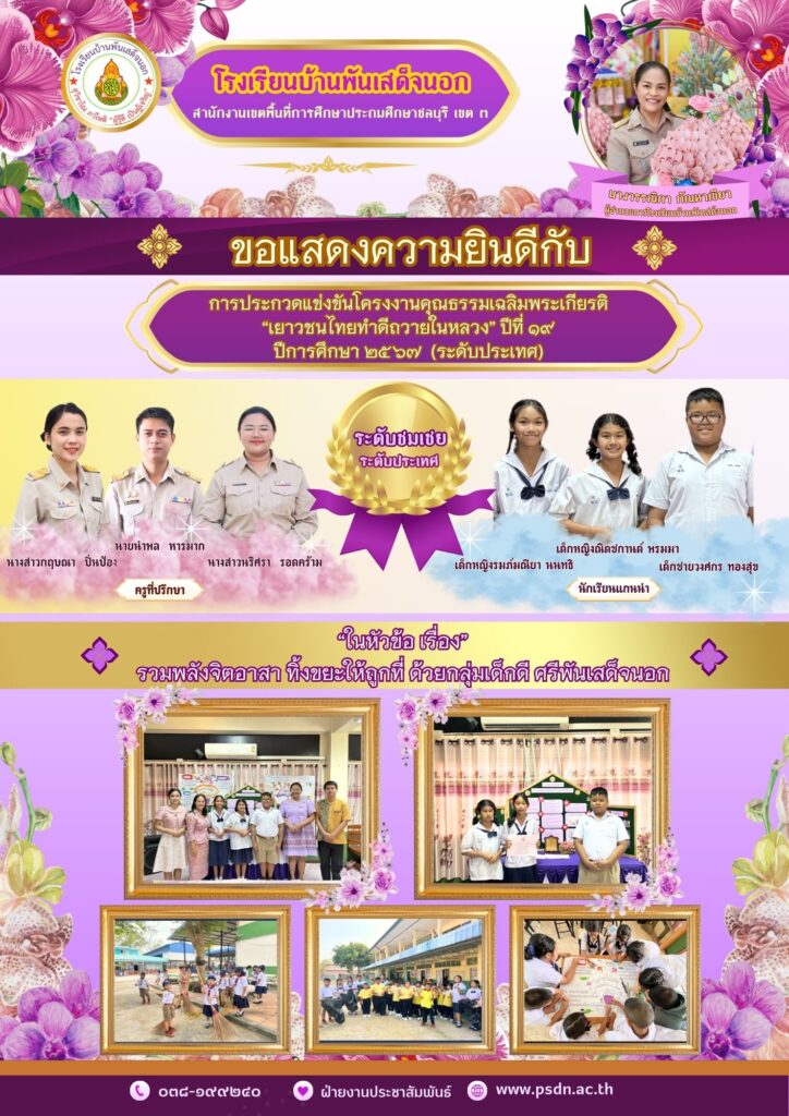 ขอแสดงความยินดีกับ โรงเรียนบ้านพันเสด็จนอก การประกวดแข่งขันโครงงานคุณธรรมเฉลิมพระเกียรติ “เยาวชนไทยทำดีถวายในหลวง” ปีที่ ๑๙ ปีการศึกษา ๒๕๖๗ (ระดับประเทศ) ได้รับรางวัลชมเชยระดับประเทศ “ในหัวข้อ เรื่อง” รวมพลังจิตอาสา ทิ้งขยะให้ถูกที่ ด้วยกลุ่มเด็กดี ศรีพันเสด็จนอก