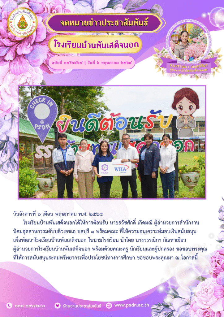 โรงเรียนบ้านพันเสด็จนอกได้ให้การต้อนรับ นายธวัชศักดิ์ เกิดมณี ผู้อำนวยการสำนักงานนิคมอุตสาหกรรมดับบลิวเอชเอ ชลบุรี ๑ พร้อมคณะ ที่ให้ความอนุเคราะห์มอบเงินสนับสนุนเพื่อพัฒนาโรงเรียนบ้านพันเสด็จนอก ในนามโรงเรียน นำโดย นางวรรณิภา กัณหาเขียว ผู้อำนวยการโรงเรียนบ้านพันเสด็จนอก พร้อมด้วยคณะครู นักเรียนและผู้ปกครอง ขอขอบพระคุณ ที่ให้การสนับสนุนระดมทรัพยากรเพื่อประโยชน์ทางการศึกษา ขอขอบพระคุณมา ณ โอกาสนี้