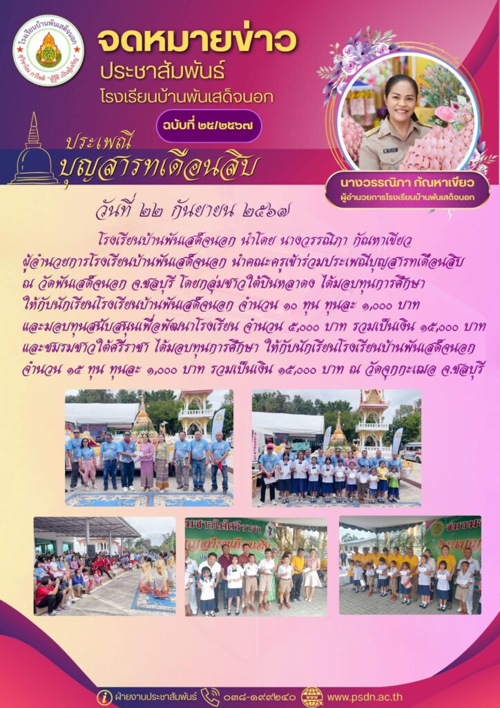 โรงเรียนบ้านพันเสด็จนอก นำโดย นางวรรณิภา กัณหาเขียว ผู้อํานวยการโรงเรียนบ้านพันเสด็จนอก นำคณะครูเข้าร่วมประเพณีบุญสารทเดือนสิบ ณ วัดพันเสด็จนอก จ.ชลบุรี โดยกลุ่มชาวใต้บินหลาดง ได้มอบทุนการศึกษาให้กับนักเรียนโรงเรียนบ้านพันเสด็จนอก จำนวน ๑๐ ทุน ทุนละ ๑,๐๐๐ บาท และมอบทุนสนับสนุนเพื่อพัฒนาโรงเรียน จำนวน ๕,๐๐๐ บาท รวมเป็นเงิน ๑๕,๐๐๐ บาท และชมรมชาวใต้ศรีราชาได้มอบทุนการศึกษาให้กับนักเรียนโรงเรียนบ้านพันเสด็จนอก จำนวน ๑๕ ทุน ทุนละ ๑,๐๐๐ บาท รวมเป็นเงิน ๑๕,๐๐๐ บาท ณ วัดจุกกะเฌอ จ.ชลบุรี