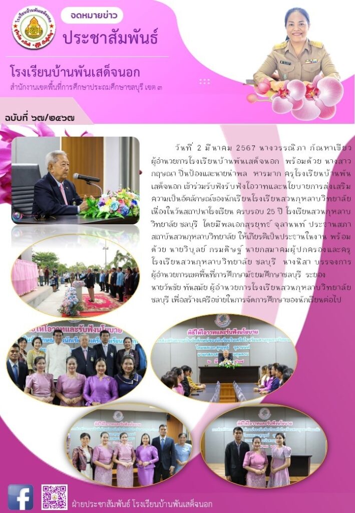 วันที่ 2 มีนาคม 2567 นางวรรณิภา กัณหาเขียว ผู้อำนวยการโรงเรียนบ้านพันเสด็จนอก เข้าร่วมรับฟังรับฟังโอวาทและนโยบายการส่งเสริมความเป็นอัตลักษณ์ของนักเรียนโรงเรียนสวนกุหลาบวิทยาลัย เนื่องในวันสถาปนาโรงเรียน ครบรอบ 25 ปี โรงเรียนสวนกุหลาบวิทยาลัย ชลบุรี โดยมีพลเอกสุรยุทธ์ จุลานนท์ ประธานสภาสถาบันสวนกุหลาบวิทยาลัย ให้เกียรติเป็นประธานในงาน พร้อมด้วย นายวิบูลย์ กรมดิษฐ์ นายกสมาคมผู้ปกครองและครู โรงเรียนสวนกุหลาบวิทยาลัย ชลบุรี นางนิสา บรรจงการ ผู้อำนวยการเขตพื้นที่การศึกษามัธยมศึกษาชลบุรี ระยอง นายวันชัย ทันสมัย ผู้อำนวยการโรงเรียนสวนกุหลาบวิทยาลัย ชลบุรี นายพันธศักดิ์ เกตุวัตถา รองนายกองค์การบริหารส่วนจังหวัดชลบุรี (ผู้แทนนายกองค์การบริหารส่วนจังหวัดชลบุรี) นายประชา เตรัตน์ อดีตรองปลัดกระทรวงมหาดไทย และอดีตผู้ว่าราชการจังหวัดชลบุรี นายสุรสิทธิ์ นิธิวุฒิวรรักษ์ อดีตสมาชิกสภาผู้แทนราษฎรจังหวัดชลบุรี นายนพรัตน์ ศรีพรหม นายอำเภอศรีราชา นายอำนาจ เจริญศรี รองผู้ว่าราชการจังหวัดชลบุรี